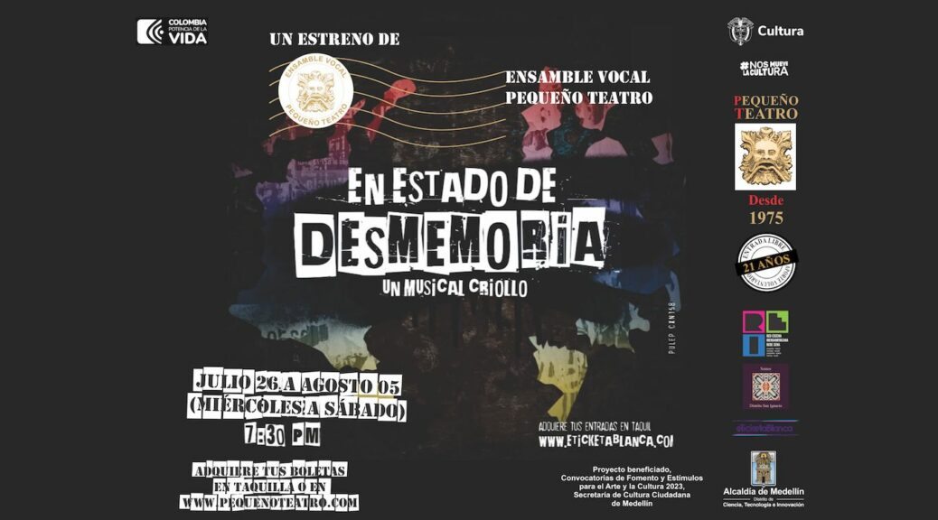 En Estado de Desmemoria, Un Musical Criollo contiene sus piezas enmarcadas en la música, la danza y el teatro, todos los números correspondientes a hechos condensadores de la historia colombiana. Es una creación colectiva que surgió desde la Escuela de Formación de Actores de Pequeño Teatro en el año 2021 que, recurriendo al uso de diversas disciplinas como la danza contemporánea, el teatro físico, el teatro musical, los ritmos colombianos, etc.; encaminó su búsqueda. Una dramaturgia y lenguaje llamado “musical criollo”, en el que se transforma la estructura del musical tradicional hacia un replanteamiento interdisciplinar. No busca sentar una única mirada o palabra, ni ser un referente académico, sino invitar a los espectadores jóvenes y adultos a la investigación y profundización de lo tratado.