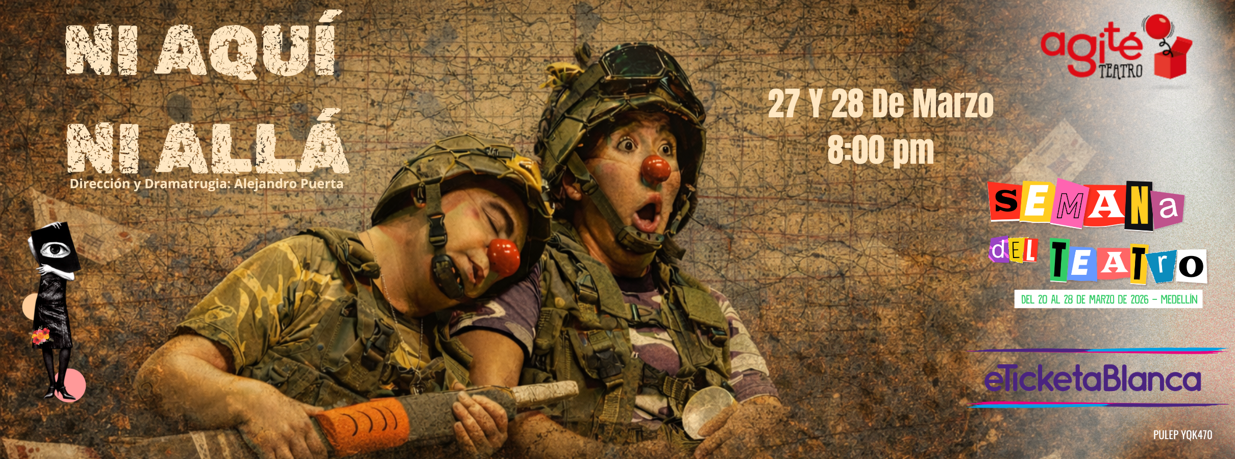 Condiciones de admisión: LA TAQUILLA ESTÁ HABILITADA PERMANENTEMENTE PARA LA COMPRA DE LA BOLETERÍA EN WWW.ETICKETABLANCA.COM., EL INGRESO AL TEATRO SE HARÁ 20 MINUTOS ANTES DE LA HORA SEÑALADA PARA INICIAR, UNA VEZ COMIENCE LA FUNCIÓN NO SE PERMITIRÁ EL INGRESO DE MÁS ESPECTADORES. LA FUNCIÓN EL INGRESO ES PARA TODO TIPO DE PÚBLICO POR TANTO NO HAY RESTRICCIÓN PARA EL INGRESO